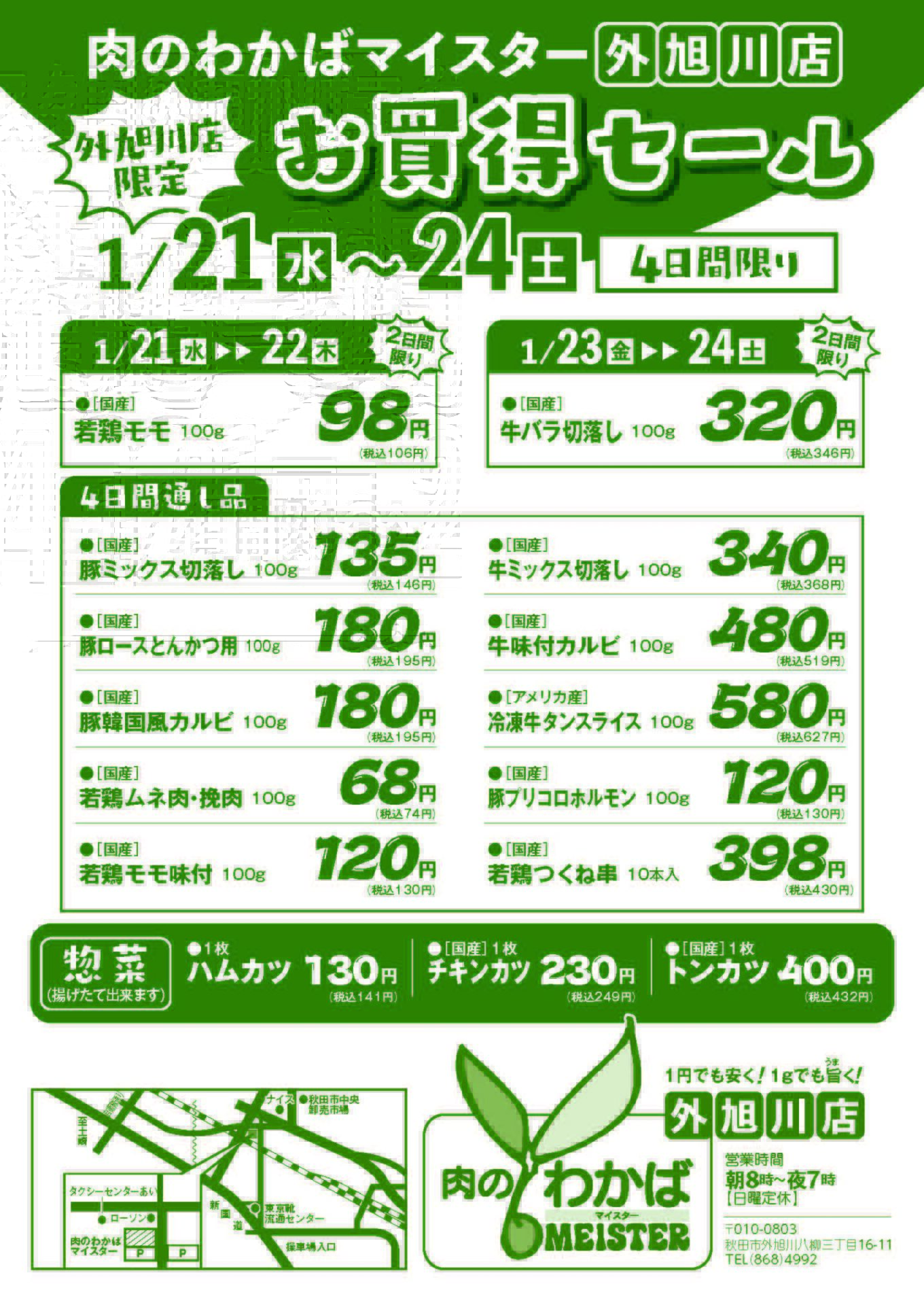 肉のわかばをご愛顧いただき誠にありがとうございます。肉のわかばマイスター外旭川店では、2026年1月のセールを開催します!掲載商品の他にも、お買い得商品を多数取り揃えて皆様のご来店をお待ちしております。