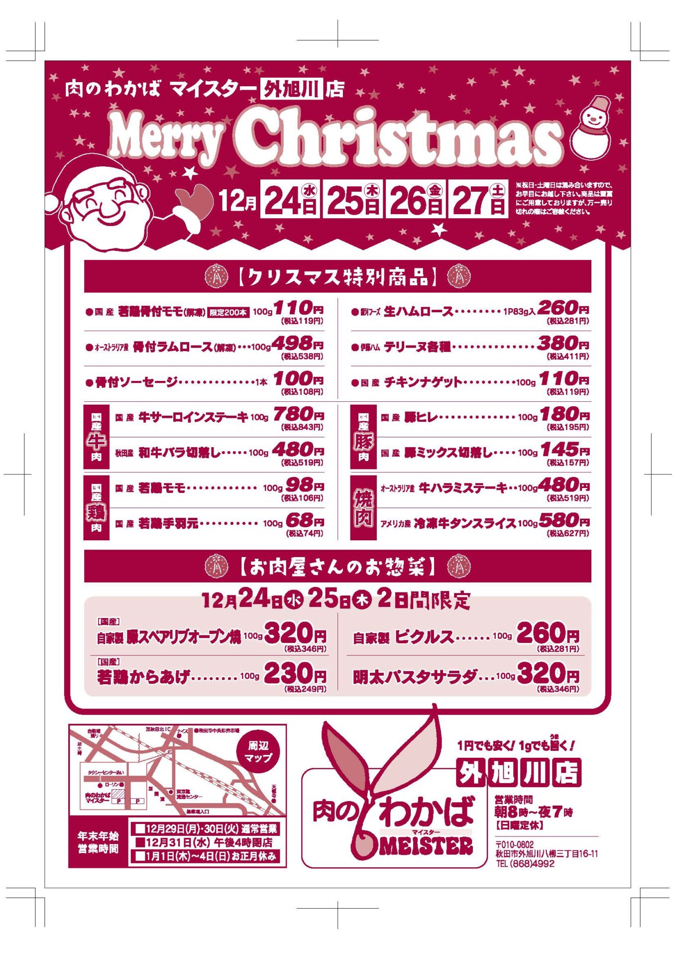 肉のわかばをご愛顧いただき誠にありがとうございます。肉のわかばマイスター外旭川店では、クリスマスセールを開催します!掲載商品の他にも、お買い得商品を多数取り揃えて皆様のご来店をお待ちしております。